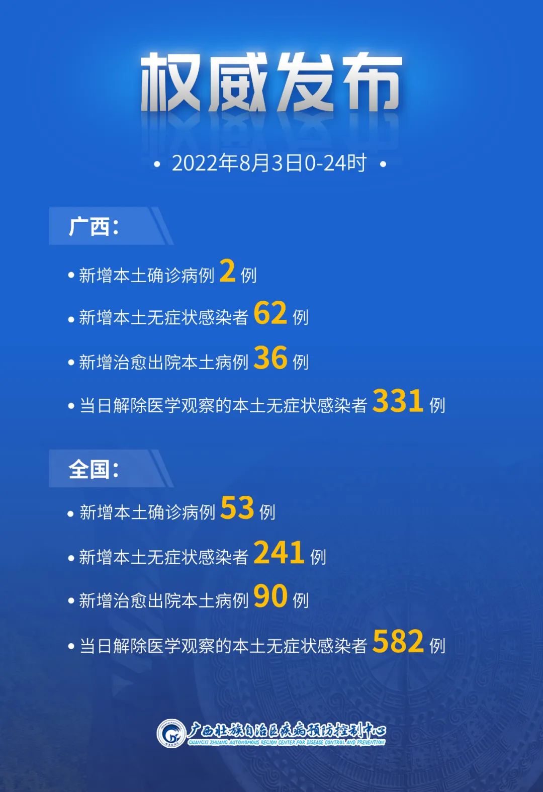 8月3日0-24时,广西新增本土确诊病例2例(均在北海市,其中海城区1例、银海区1例),含1例无症状感染者转确诊病例(北海市);本土无症状感染者62例(崇左市48例,其中宁明县27例、大新县16例、凭祥市4例、江州区1例;北海市海城区12例;南宁市武鸣区1例;防城港东兴市1例)。