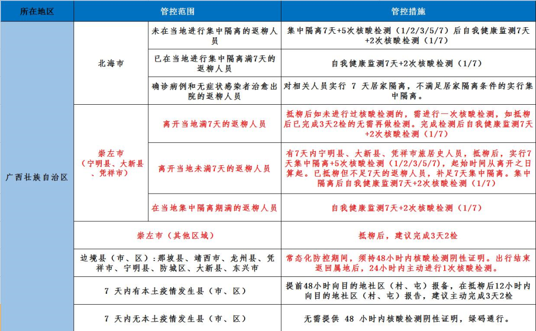 5、建议区外无本土疫情发生的县(市、区、旗)返桂来桂人员,抵桂24小时内主动进行1次核酸检测。