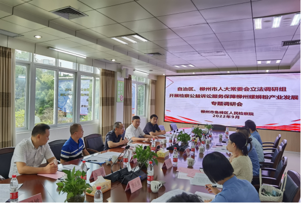 下午,调研组到鱼峰区人民检察院召开座谈会,听取检察长梁韬作的《检察公益诉讼服务保障螺蛳粉产业发展新思路》专题汇报。会上,两名特邀检察官助理就各自领域提出对《柳州螺蛳粉产业发展条例(草案)》的建议。与会人员围绕条例(草案)的相关内容进行了深入探讨和交流。戴红兵充分肯定区检察院依法履职在促进生态环境保护、保障食品安全等方面起到的重要作用,并对区检察院今后帮助柳州螺蛳粉企业依法维权工作提出建议。