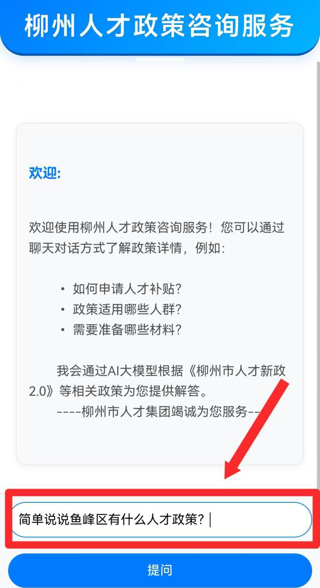 4.在对话框内输入“鱼峰区有什么人才政策”“鱼峰区人才分为哪几类”等关键词,点击提问。