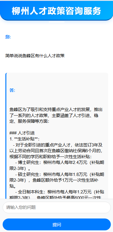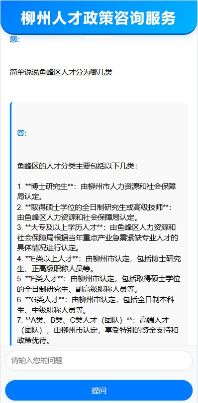 整合柳州市人才分类认定、生活补贴、购房补贴等7大类政策库,以及鱼峰区《重点产业人才支持保障办法》等差异化条款,形成涵盖A-G类人才的全周期政策知识图谱。