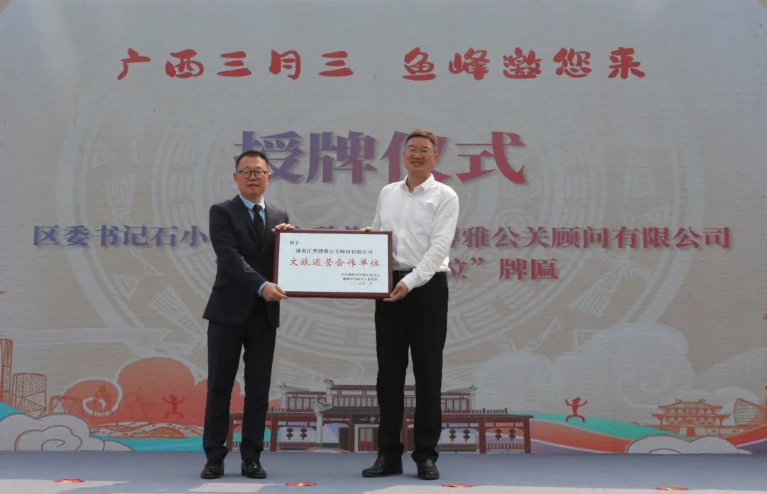仪式上,区委书记石小松授予珠海汇华博雅公关顾问有限公司“文旅运营合作单位”牌匾;会上对白沙文旅项目和产品及鱼峰区文旅资源进行了推介。柳州市印记白沙文旅发展公司与产品供应链代表签约;柳州市印记白沙文旅发展公司与旅行社渠道商代表签约。