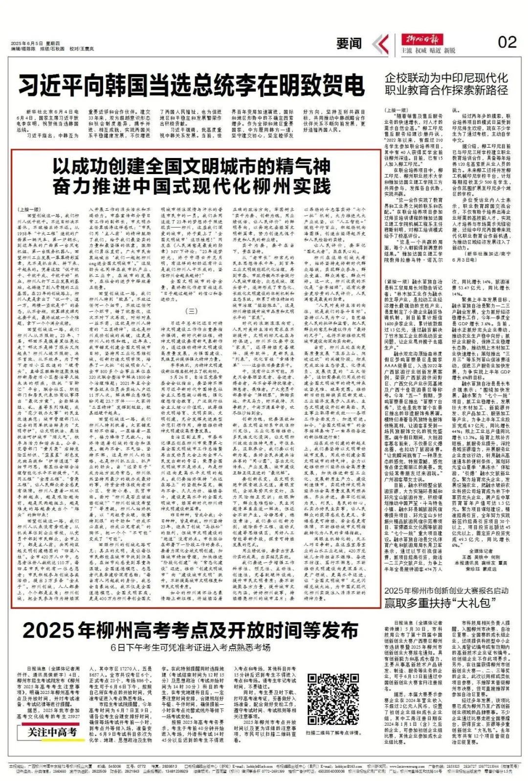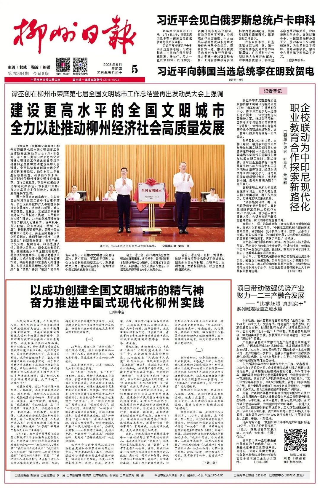 6月5日,《柳州日报》头版发表署名“柳仲言”的评论文章,题目是《以成功创建全国文明城市的精气神 奋力推进中国式现代化柳州实践》,全文约6200字。