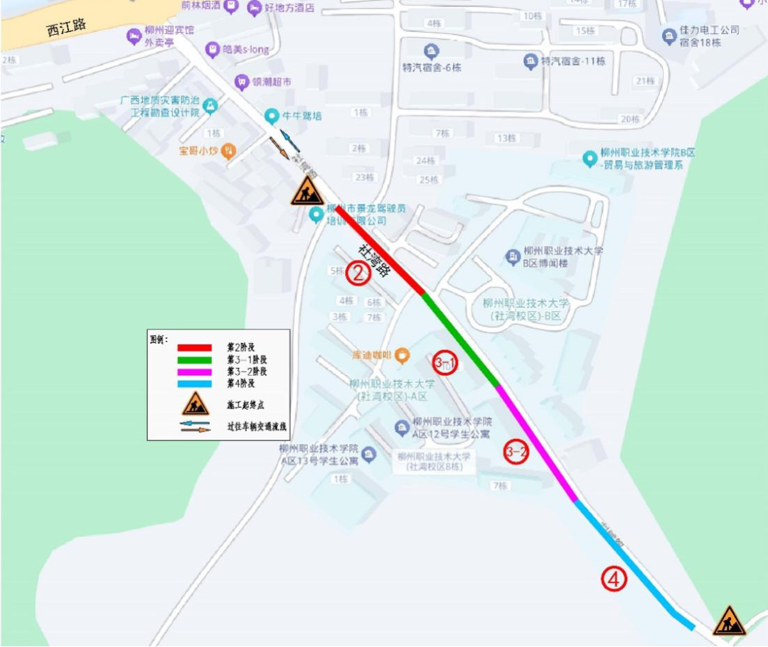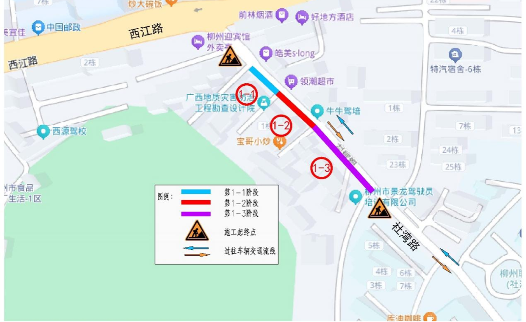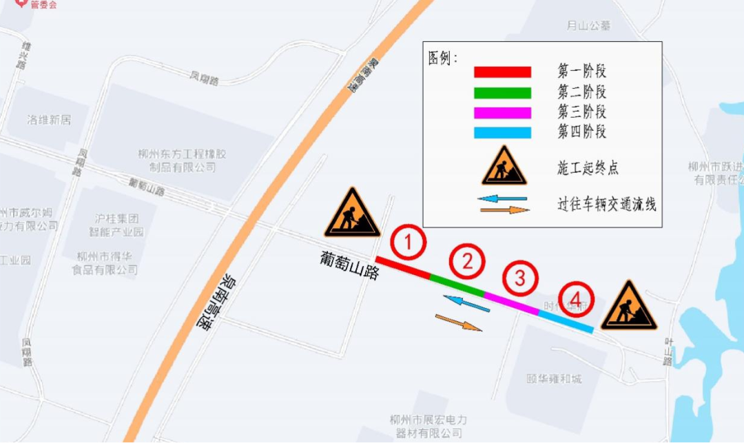 因柳州市鱼峰区北片区排水管网改造建设工程需要,根据《中华人民共和国道路交通安全法》第三十九条规定,定于2025年11月27日起,对社湾路、葡萄山路(东一路至河表西路路段)部分路段进行占道施工。具体通告如下: