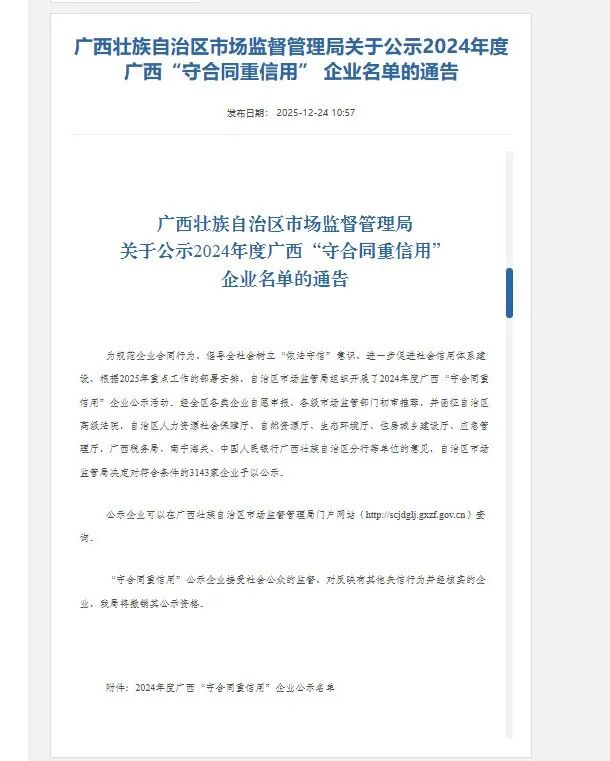 近日,自治区市场监管局公示2024年度广西“守合同重信用”企业名单,鱼峰区80家企业上榜,数量位列柳州第一。