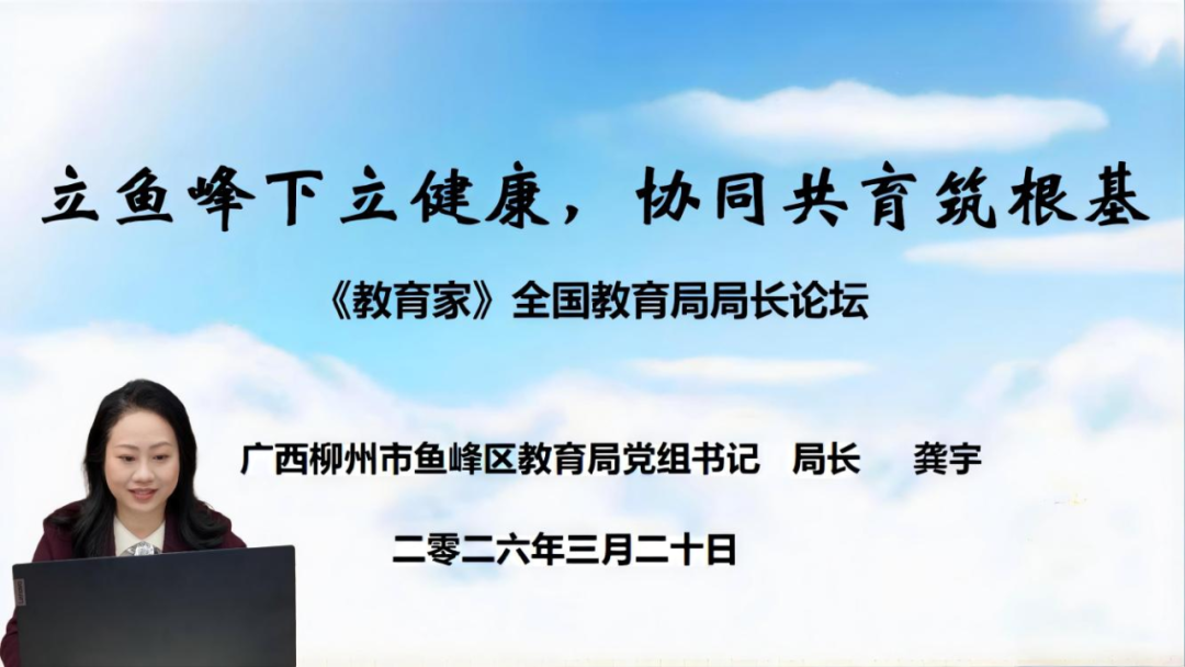 近日,2026年《教育家》全国教育局局长论坛第一期顺利举办,鱼峰区教育局党组书记、局长龚宇受邀参会。围绕教育部“健康第一”教育理念,以《立鱼峰下立健康,协同共育筑根基》为题作经验分享,向全国教育同仁推介鱼峰区家校社协同育人的特色实践与成果。