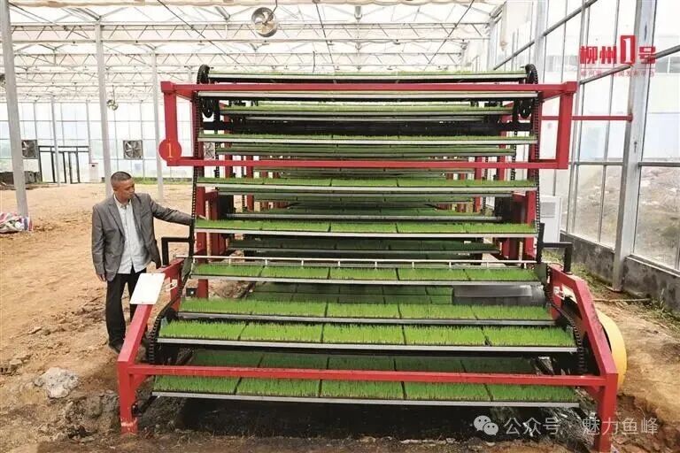 记者走进恒温恒湿的育秧大棚看到,一条自动化育秧生产线全速运转。传送带匀速运行,一盘盘翠绿秧苗整齐排列、快速流转。“数字化管理,精准控制每一粒种子、每一寸基质。”柳州群农耕丰有限公司经理甘勇强指着流水线介绍,这套设备24小时不间断作业,单次产能可满足100亩以上稻田用秧,效率较传统育秧方式提升数倍。