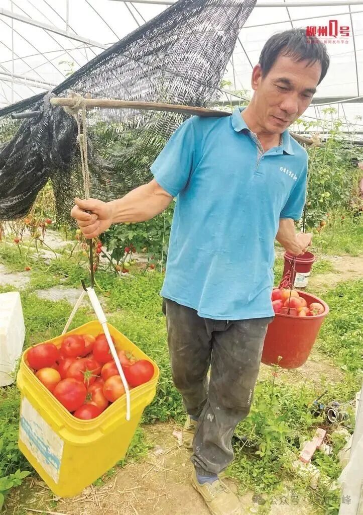 村民挑着刚刚采摘的西红柿走出大棚。
