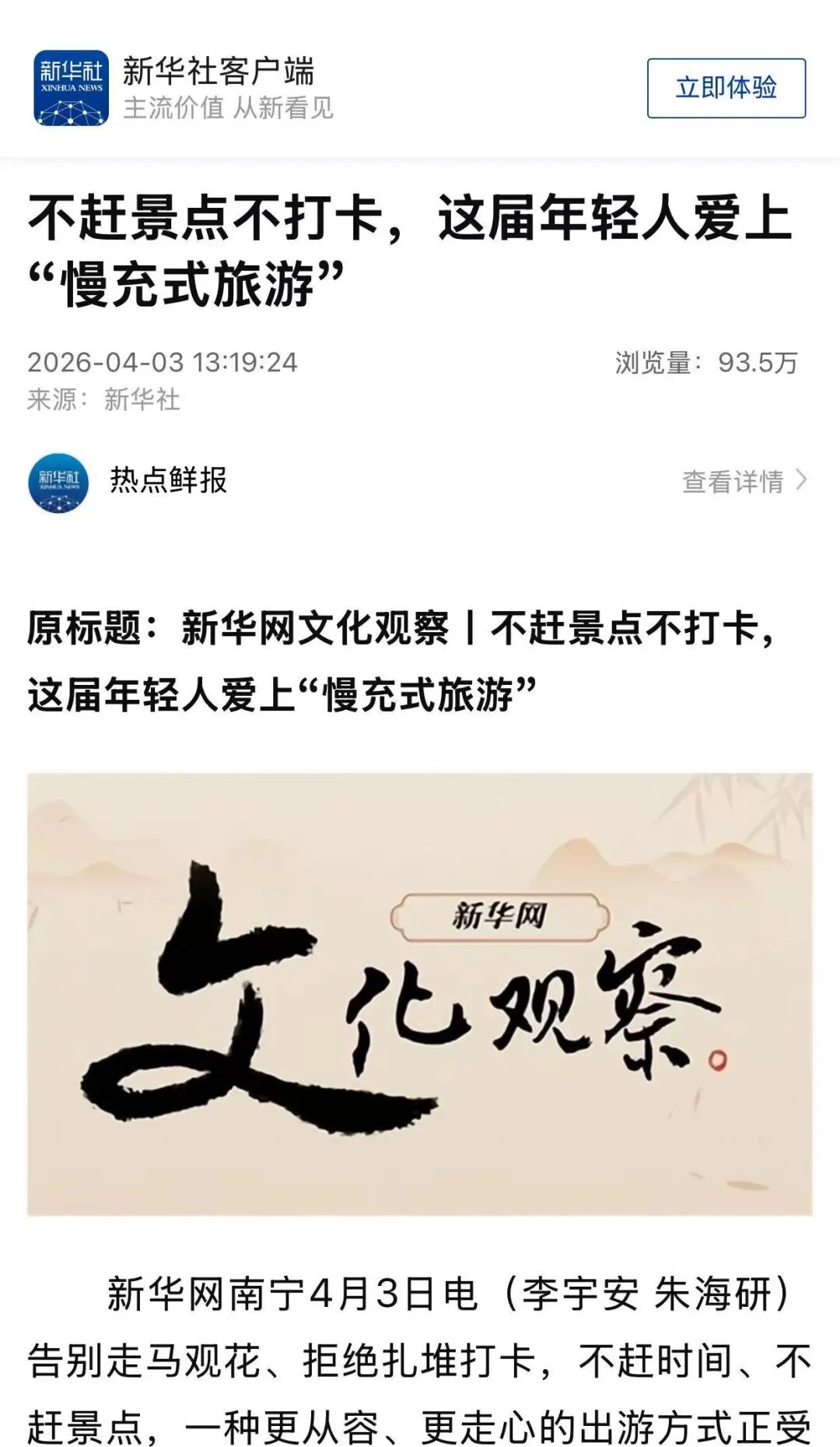 告别走马观花、拒绝扎堆打卡,不赶时间、不赶景点,一种更从容、更走心的出游方式正受到越来越多年轻人的青睐。相较于追求效率的“特种兵式旅游”,“慢充式旅游”强调慢节奏、深体验、重感受,倡导在旅行中放慢脚步、沉淀内心,通过深度沉浸获得情绪价值与精神滋养。