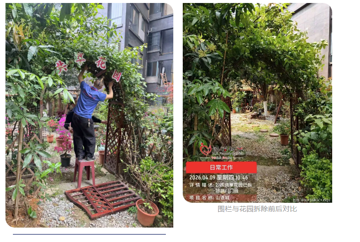 随后,社区书记带队前往违建现场实地调解。调解员继续以方言晓以利害,详细说明安全隐患与公共利益关系,最终使涉事业主心悦诚服,主动配合拆除。围栏与花园设施被当场清理,纠纷高效化解。