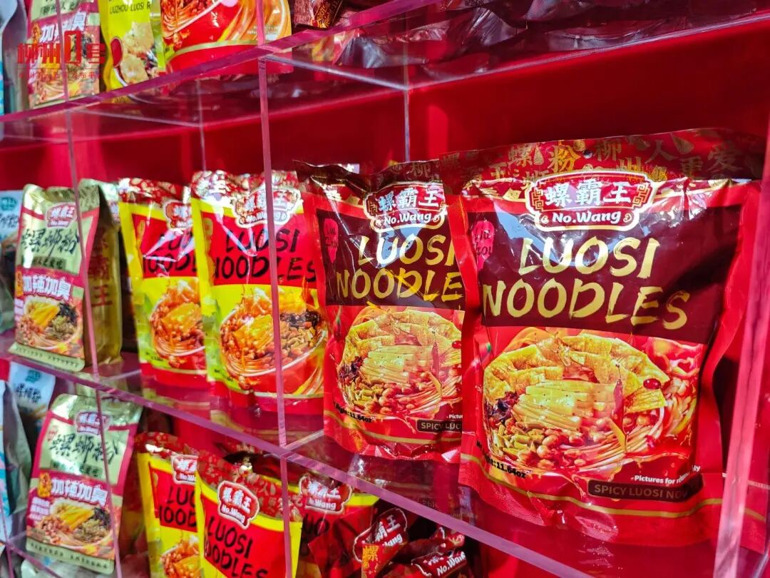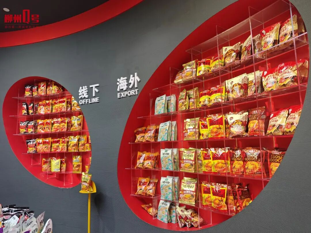 △ 广西螺霸王食品科技有限公司螺蛳粉文化展览馆内,陈列着预包装柳州螺蛳粉出口产品。