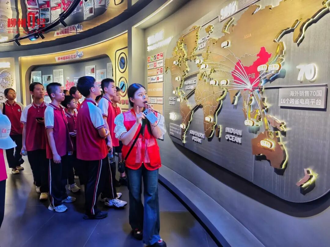△ 4月14日,广西螺霸王食品科技有限公司螺蛳粉文化展览馆内,讲解员向前来参观游学的学生介绍预包装柳州螺蛳粉出口情况。