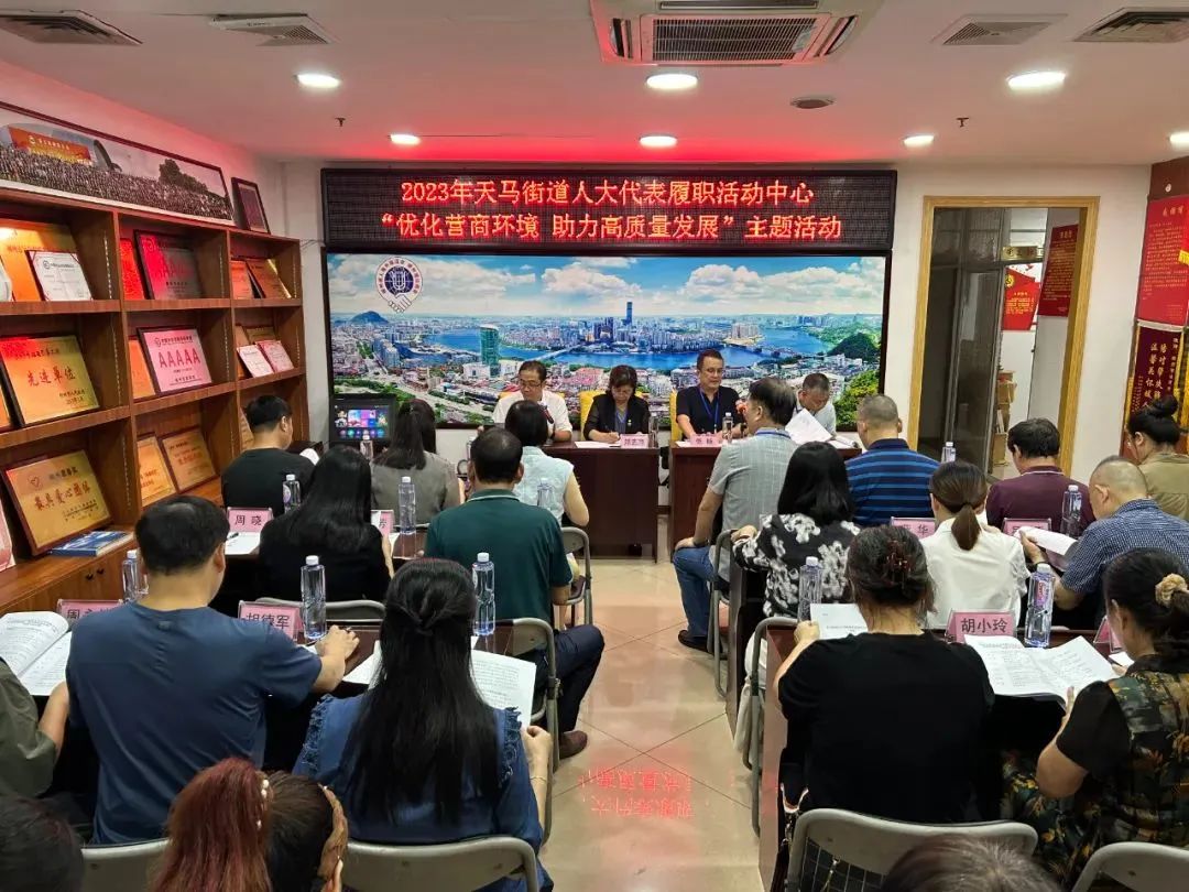 9月14日上午,天马街道人大代表履职活动中心开展“优化营商环境 助力高质量发展”主题活动。参加活动的有柳州市人大代表张杨,市区两级代表郑艺萍,鱼峰区人大代表叶志勇等驻天马街道人大代表履职活动中心代表,天马街道政协委员、相关职能部门及辖区群众代表。