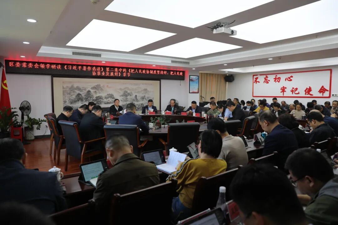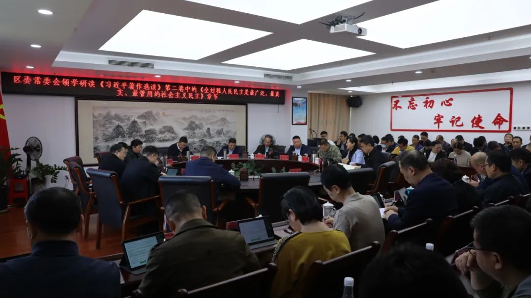 区人大常委会主任郑艺萍领学研读《习近平著作选读》第二卷中的《全过程人民民主是最广泛、最真实、最管用的社会主义民主》章节。