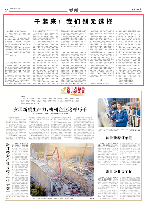 动起来、干起来、拼起来,把比较优势转化为发展优势,把历史机遇转化为现实生产力。新春上班第一天,从政务中心到边关口岸,从生产车间到项目工地,从城市社区到山乡村寨,广西儿女实干争春,八桂大地一片蒸腾。
