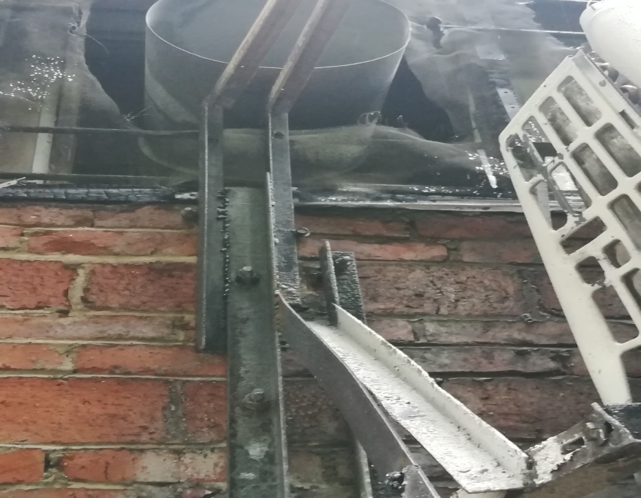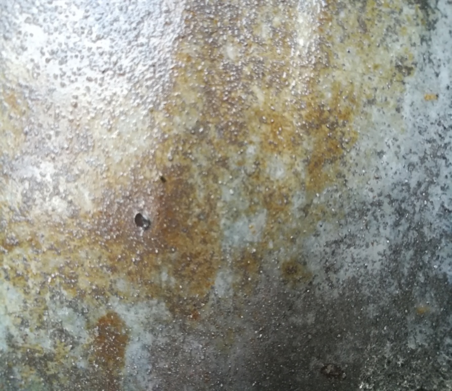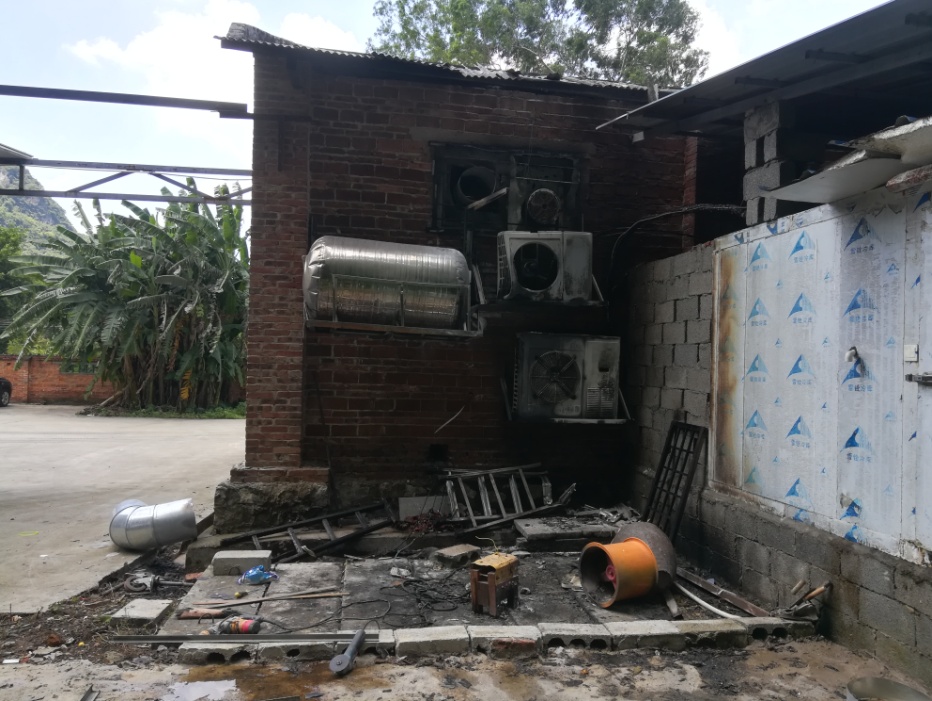 现场的空置房南侧墙外避上存不锈钢罐1个、空调外机2个、通风管口1个,不锈钢罐、通风管口和空调外机呈西向东排列,已安装好的通风管口中点位于不锈钢罐与空调外机之间距离不锈钢罐顶部上方75厘米,不锈钢罐为圆柱形,罐长150厘米、直径79厘米,采用0.4毫米201不锈钢材质制造,其最上部与通风管口中点的距离为79厘米,罐体东侧罐口直径42厘米,东侧罐口边盖距离上、下两台空调外机分别为35厘米和59厘米,罐体东侧边盖完全被掀开呈完全脱落状态,上空调外机西侧机箱向内凹陷,罐体靠近距东侧边缘7.2厘米、距上部中线15厘米处有1个1×0.9毫米的贯通孔,贯通孔边缘圆滑,该孔的西侧有1圆滑金属堆积。现场未发现任何安全警示标志或其残留物,不锈钢罐上未有生产厂家标识或其残留物。现场地面遗留有电焊机1台、焊条1包(已开封)、角磨机1台、冲击钻1台、人字梯1个、剪刀1把、螺丝批1把,排风扇1个、镀锌通风管1个。