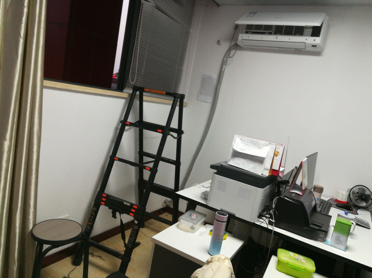 结构,西侧为固定式不可以动,宽度为0.91米,东侧为两扇可移动式铝合金窗户,可开宽度为0.87米。现场窗台边摆放有1镁多力牌六级多功能升降可行走人字梯,遗留有1个工具包,包内有铁钳、扳手、遥控器、电流表等物品,现场未发现有安全帽、安全绳等安全保护装备。坠落点地面距离窗台高度为8.8米,被撞击的空调室外机为保安室空调室外机,距离地面安装高度为顶部1.7米、底部0.57米,室外机顶部西南侧被撞凹,坠落处地面放置的水泥隔离桩已经倒下,坠落点地面未发现有安全帽或安全帽碎片。