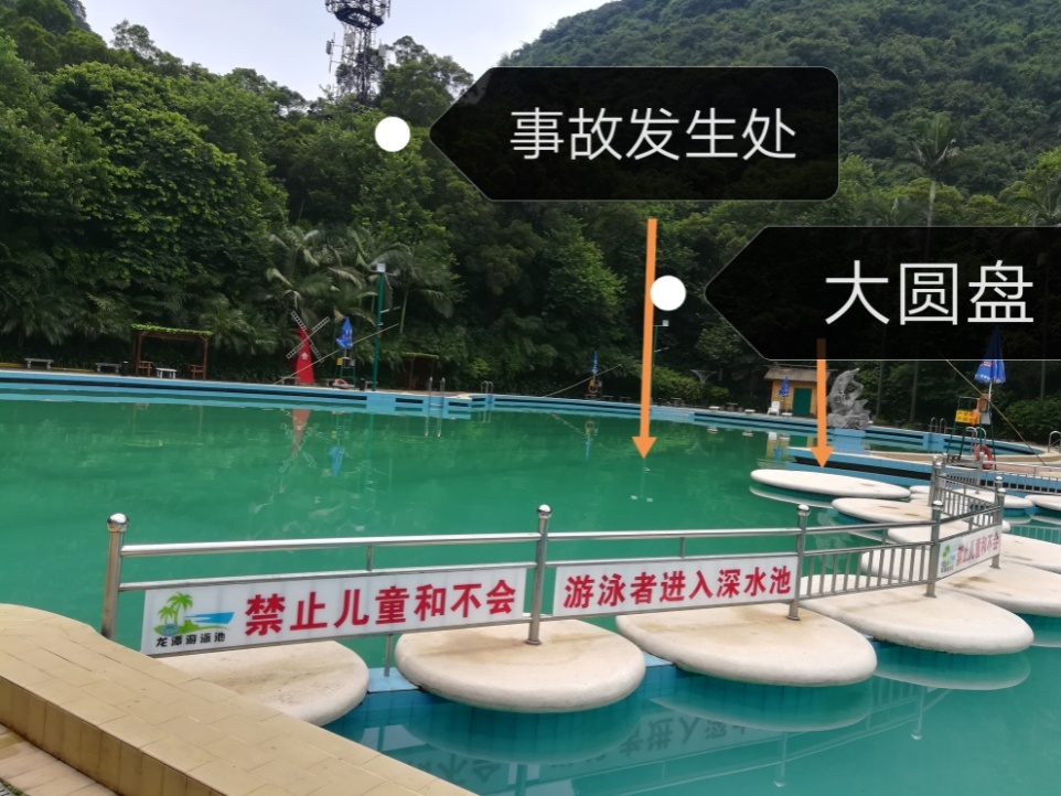 万宇游泳池由3个不规则圆形组成,总经营面积2250㎡,其中建筑物面积260㎡,水域面积约1600㎡,内分布有戏水池、浅水区(0.8-1.2米,面积约700㎡)、深水区(水深1.6-1.9米,面积约800㎡),日常水温23-28℃。事故发生处位于深水区中部,水深约1.65米;相似天气情况下的9月5日20时21分,事故发生处水温测量为26℃。