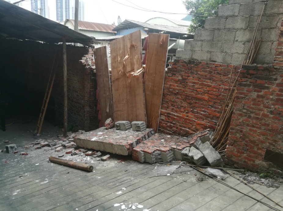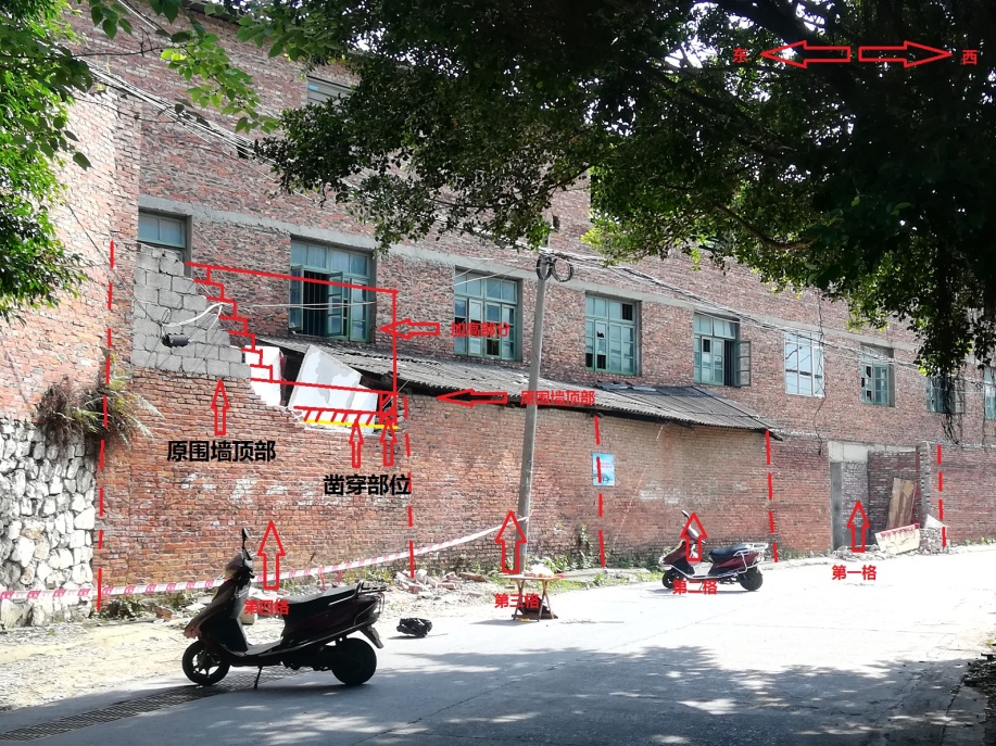 站在九头山道路面对事故现场的围墙,该围墙是在3米高的红砖墙上进行了加高,左侧的水泥砖(规格39厘米×20厘米×20厘米)加高1.5米,右侧的红砖(规格24厘米×12厘米×5厘米)加高1.5米,围墙与车间外墙靠近在拆围墙处,残留有原倒塌的墙体,墙体最高处4.5米,最低处2.35米,被推入墙内的墙体,最长3.5米,最高1.08米,已经断为3段,呈不规则形状,现场事故部位墙体内外散落有红砖和水泥砖碎块。墙外恢复性摆放了一部杭州SERIS H30叉车,叉车臂距离地面2.0米,事故倒塌围墙部位,有一根斜拉的电杆固定钢缆。