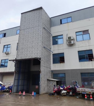 事故发生地位于柳州市鱼峰区南环路x号x号厂房,涉事设备为3T液压升降平台,用于x号厂房二楼、三楼货物垂直运输的机械设备,由一个工作平台、液压电动装置、钢丝绳、链条等组成,采用导轨式液压升降。平台有效台面为3.3米×3.3米,可升高15.7米,共三层电器,电机功率为5.5kw,规格型号为3T-15.7米,供货方为广西耀中起重设备有限公司。涉事设备只有工作平台,没有轿厢,平台有三面护栏,护栏上悬挂有“禁止乘人”的警示标识;一楼没有层门,二、三楼进出平台各设有卷闸门作为平台与楼道间的隔断,出入口无栏杆或围栏等其他临边防护措施。