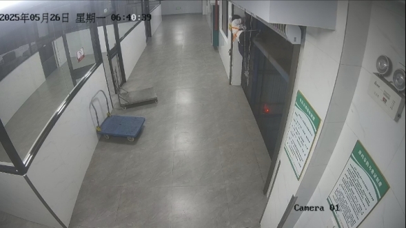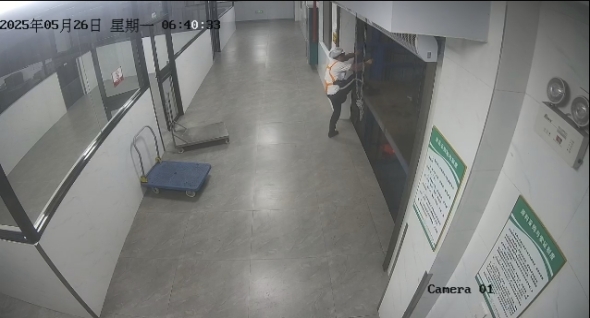 2025年5月26日6时30分左右,韦某妹、陈某钰、陈某成3人将早餐及餐具等物品都分拣、打包装好后,用板车、餐饮小推车把货物都拉到升降平台二楼门口处。陈某钰操作遥控器打开卷闸门,3人将货物拉到平台内放置好后,人和货物一起乘坐平台降至一楼,把货物从平台内拉出装上餐饮配送车,装车好后,陈某钰、陈某成2人开车离开。6时40分,韦某妹用遥控器操作升降平台,乘坐升降平台把空的板车、餐饮小推车送上二楼,于6时40分26秒升降平台到达二楼,此时,升降平台并没有停靠在二楼,而是继续缓慢上行,韦某妹两手就各拉一个板车走出平台,把板车放到墙根处后回头,发现平台仍缓慢上行,继而匆忙跑向升降平台并攀爬,但未能完全爬上,大半身体在平台外,人被平台带着往上行走。于6时40分44秒,平台上升至卷闸门时,韦某妹被挤压后坠落,后背先撞击在二楼坑沿后坠落至一楼底坑。