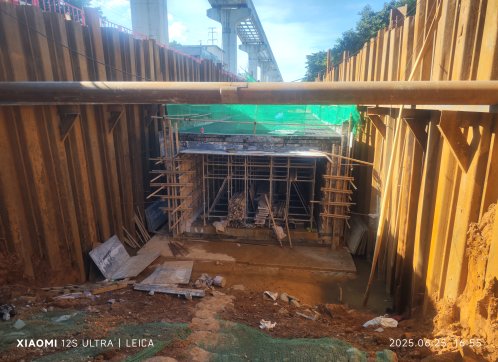 事故发生地位于柳州市鱼峰区南片区排水管网改造建设工程燎原路段(图1、2),事发时项目部按排水箱渠施工顺序施工至顶板钢筋施工。根据施工设计,排水箱渠宽5米、高3米,采用单根长12米的热轧U型钢板桩进行支护(图3),排水箱渠顶板边缘至用于支护的热轧U型钢板桩约0.9米(图4),排水箱渠临边未见搭设防护栏杆和支挂安全网(图5)。