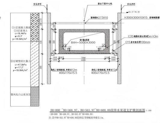 荣军路至燎原路排水渠道工程新建d1000~d2000排水管,管道总长67m(不含雨水口连接管);新建B×H=4500×2500~5000×3000mm排水管,新建渠道总长1600m。总体施工顺序:施工准备→三通一平→测量放线→围挡施工→燎原路支护施工→燎原路结构施工→燎原路道路施工→蝴蝶山路支护施工→蝴蝶山路结构施工→蝴蝶山路道路施工→七彩路支护施工→七彩路结构施工→七彩路道路施工。排水箱渠施工顺序:沟槽验收→垫层施工→底板钢筋绑扎→底板模板安装→底板砼浇筑→支架施工→顶板钢筋施工→顶板模板施工→顶板混凝土施工→混凝土养护→模板及支架拆除施工→沟槽土方回填施工。