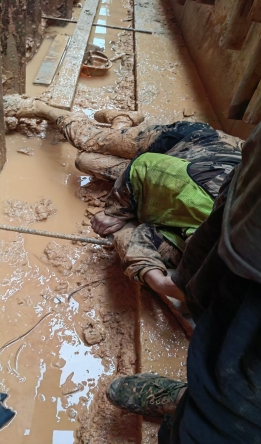 2025年6月22日下午,宋某高在排水渠顶板平台上绑扎钢筋。当日因降雨导致平台表面湿滑,至16时50分左右,宋某高起身准备去取钢筋时不慎滑倒,从平台边缘坠落至基坑底部(图6、7)。