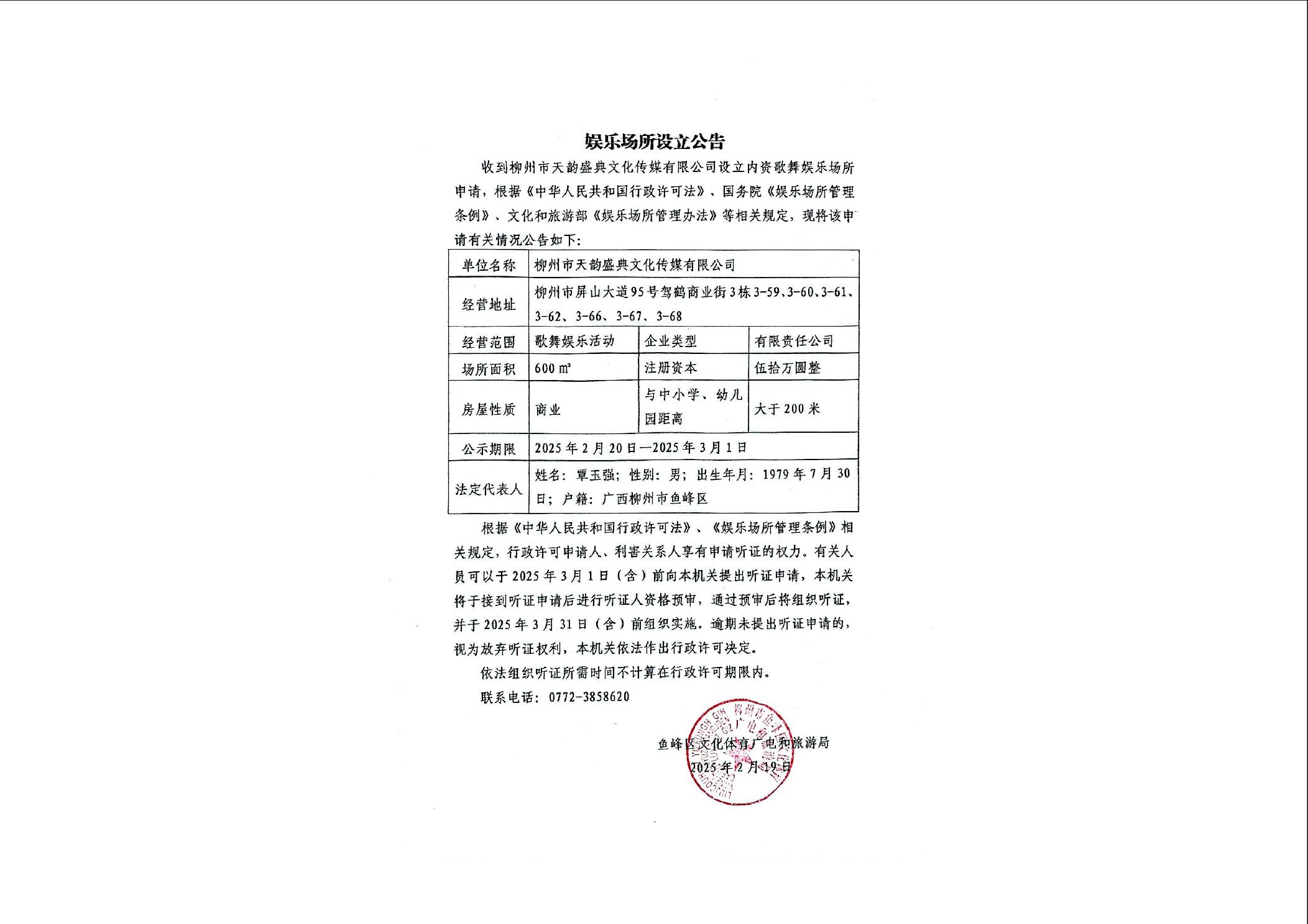 娱乐场所设立公告(柳州市天韵盛典文化传媒有限公司)