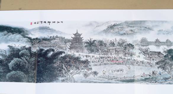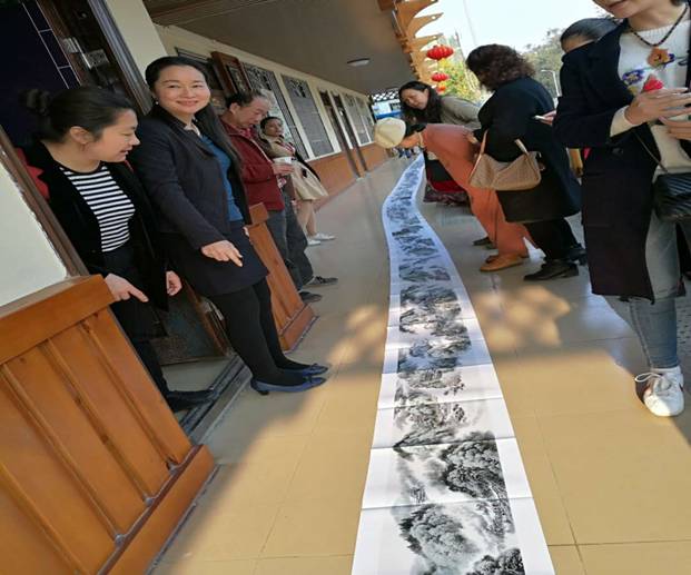 最后,朱老师将收藏的长达米的九曲柳江万古流画卷展开供大家欣赏,画卷由多幅山水画组成,每一幅画既有独立主题,又能融入整体风格,犹如一笔呵成,画面连绵不绝,蔚为壮观。由于是仿照清明上河图的画法,又被称为柳州版的“清明上河图”。画卷平铺在地上,多娇的柳江呈现在读者面前,人们仿佛身临其境,对柳江河的地理人文历史有了更深刻具体的认识