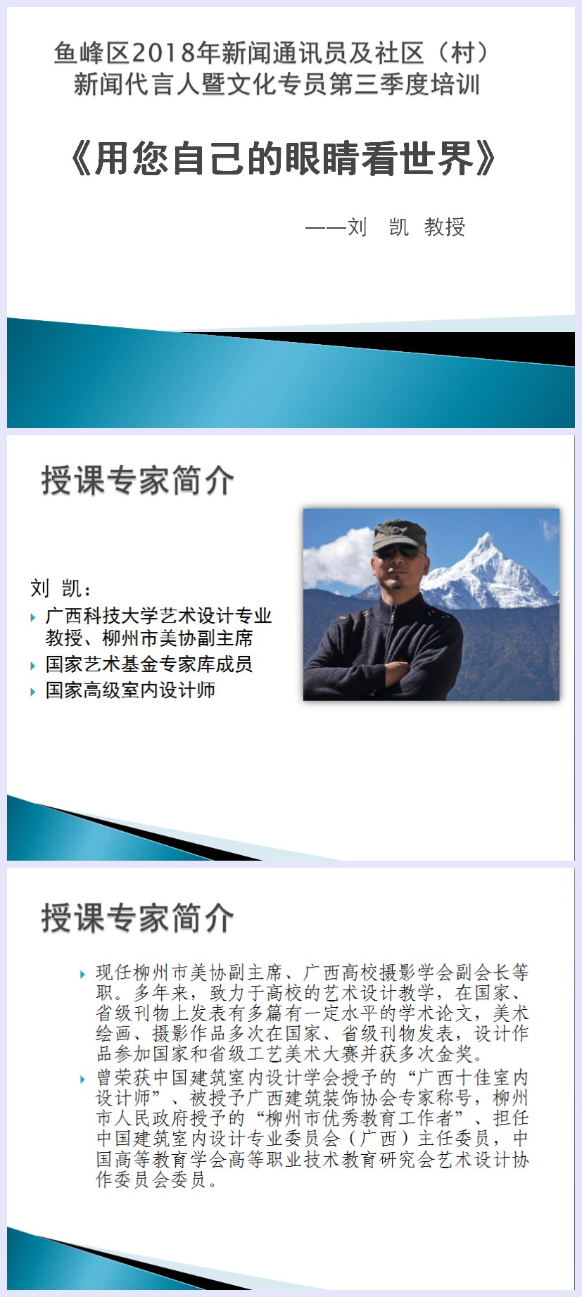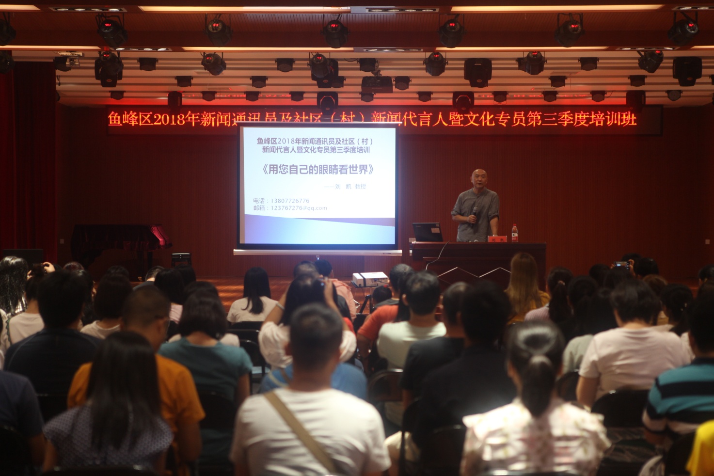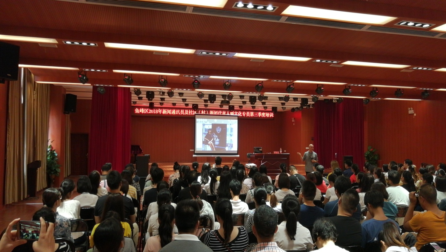 8月29日下午,主题为《用您自己的眼睛看世界》的鱼峰区2018年新闻通讯员及社区(村)新闻代言人暨文化专员第三季度培训活动在鱼峰区文化馆一楼剧场举行。活动邀请到广西科技大学艺术设计专业教授、柳州市美协副主席、国家高级室内设计师刘凯老师担任授课专家,来自鱼峰辖区的近200名新闻通讯员、社区(村)新闻代言人以及文化专员参加了培训。