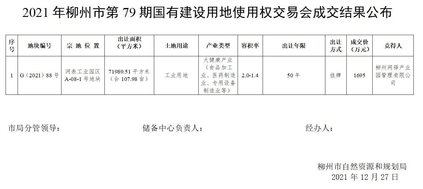 2021年柳州市第79期国有建设用地使用权交易会成交结果公布