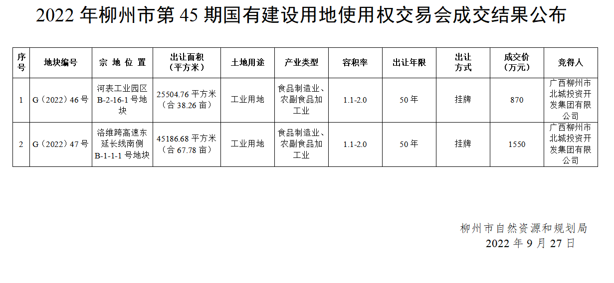 2022年柳州市第45期国有建设用地使用权交易会成交结果公布