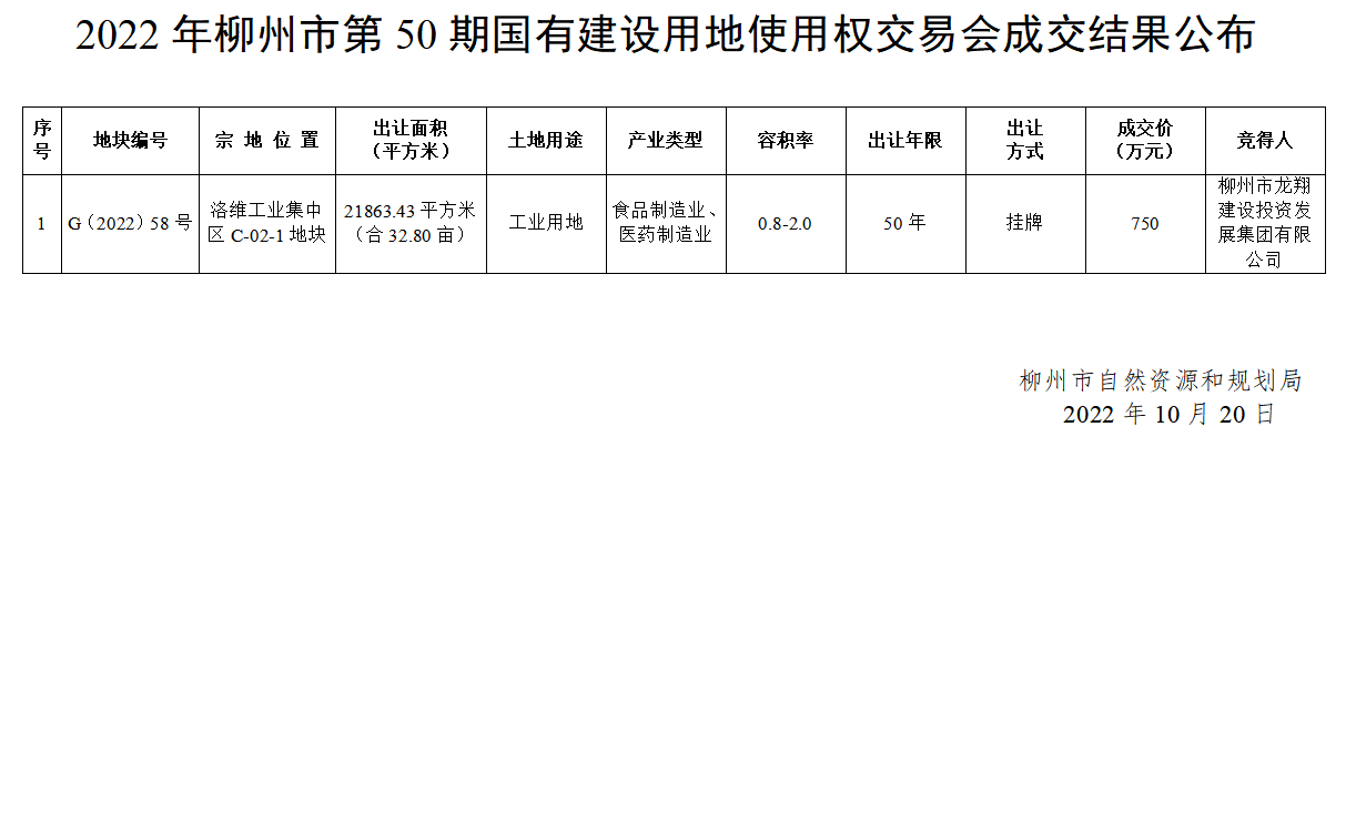 2022年柳州市第50期国有建设用地使用权交易会成交结果公布