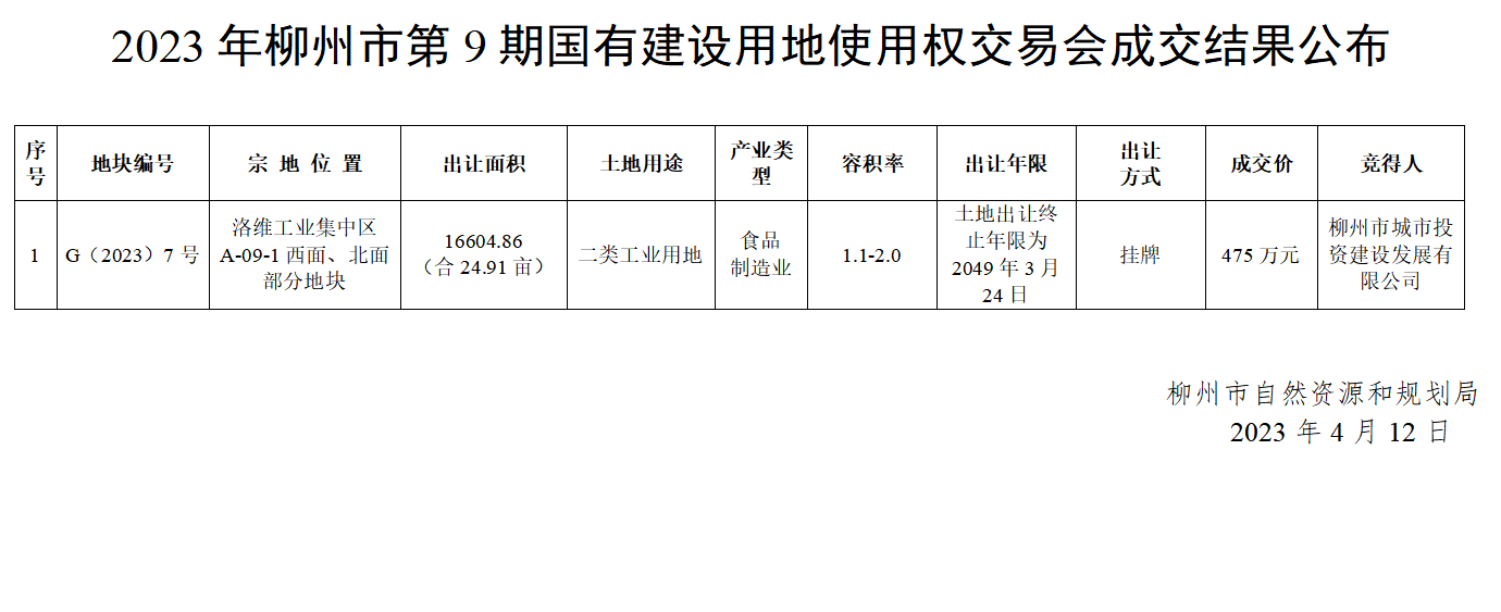 2023年柳州市第9期国有建设用地使用权交易会成交结果公布