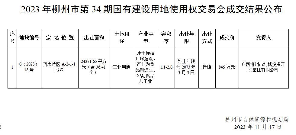 2023年柳州市第34期国有建设用地使用权交易会成交结果公布