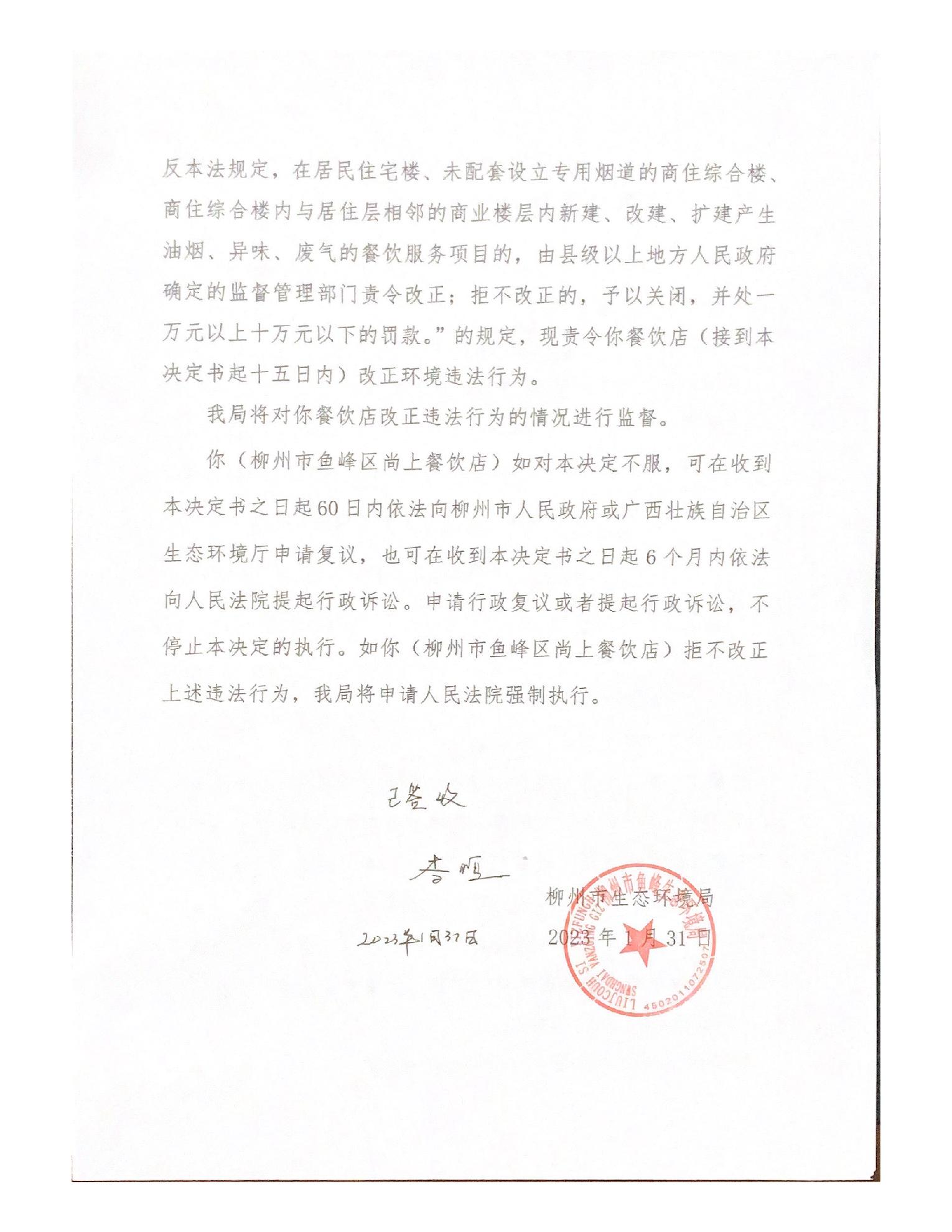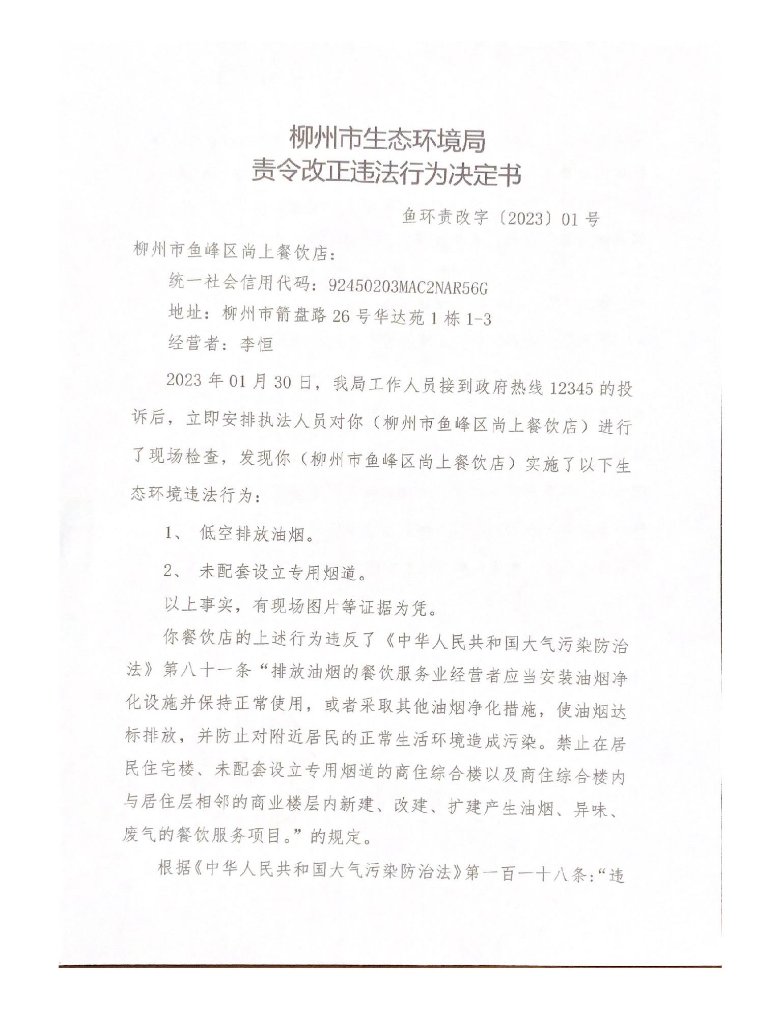 柳州市生态环境局责令改正违法行为决定书(鱼环责改字〔2023〕01号 )