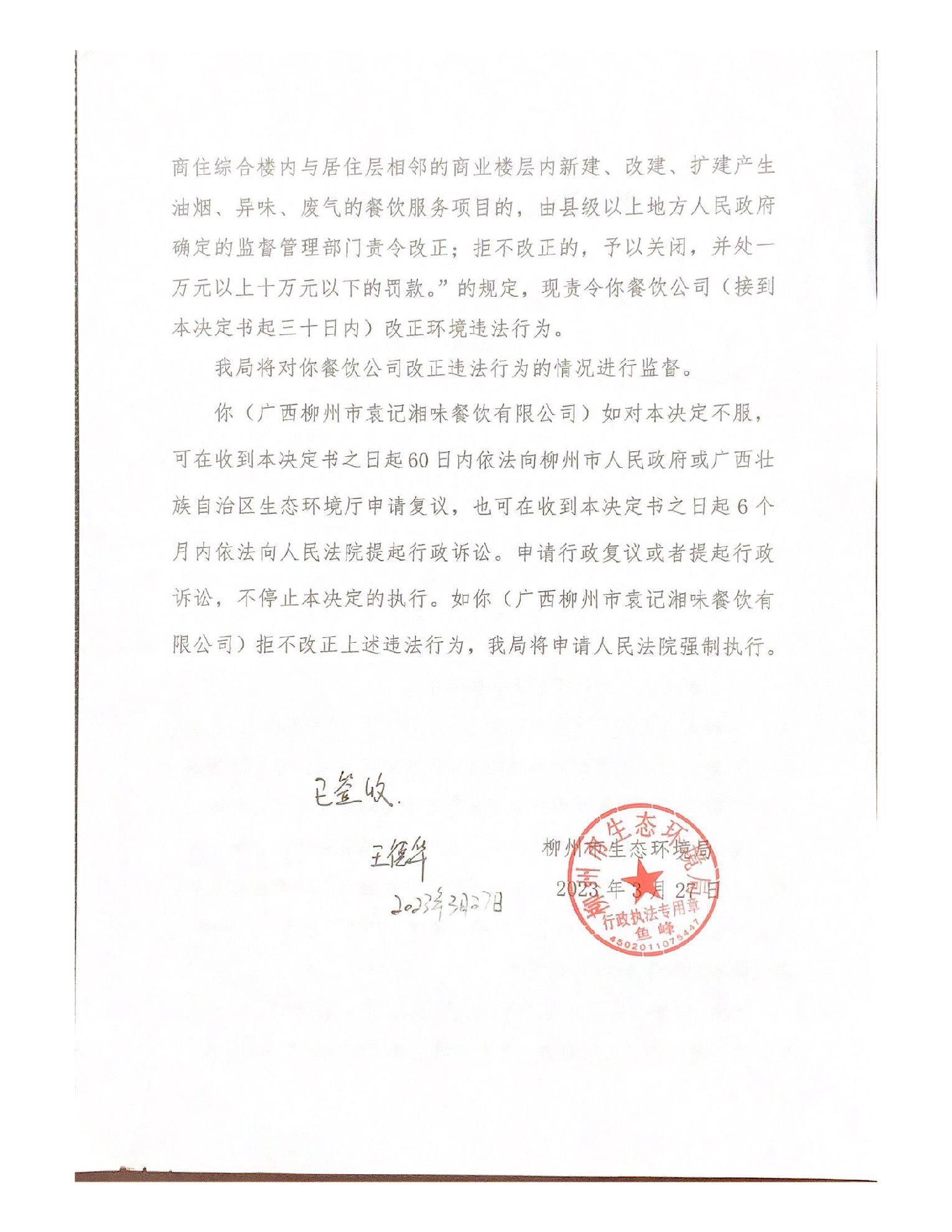 柳州市生态环境局责令改正违法行为决定书(鱼环责改字〔2023〕3号)广西柳州市袁记湘味餐饮有限公司