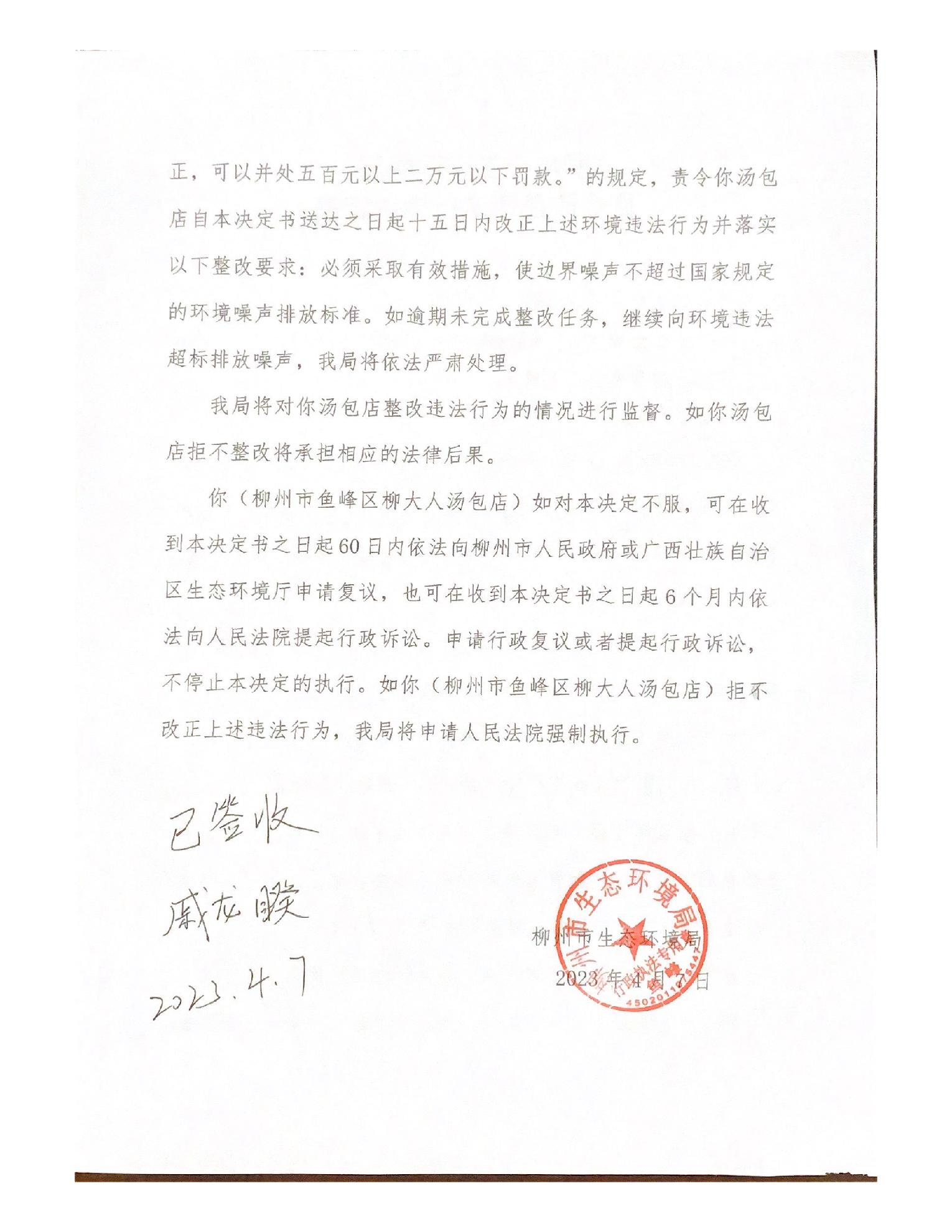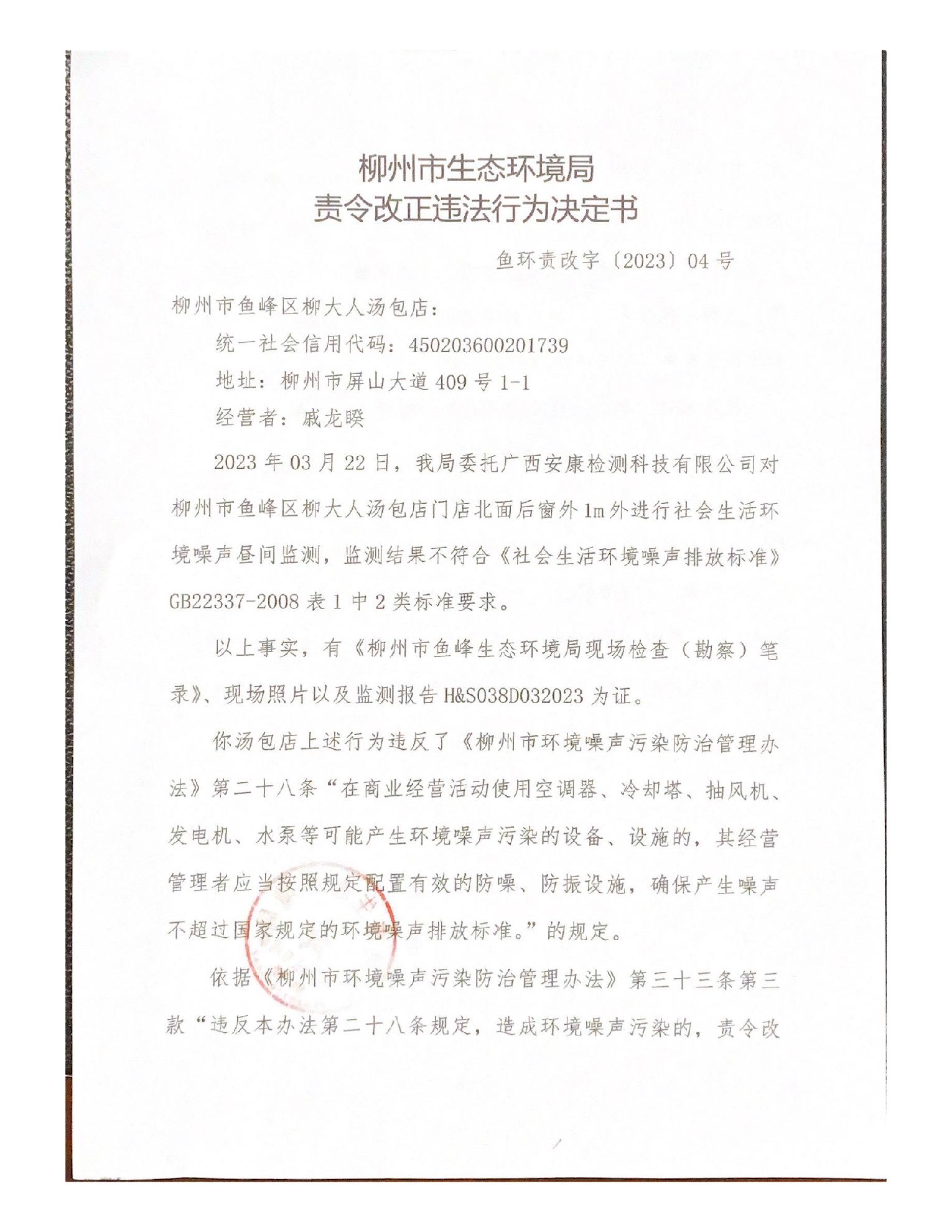 柳州市生态环境局责令改正违法行为决定书(鱼环责改字〔2023〕4号)柳州市鱼峰区柳大人汤包店