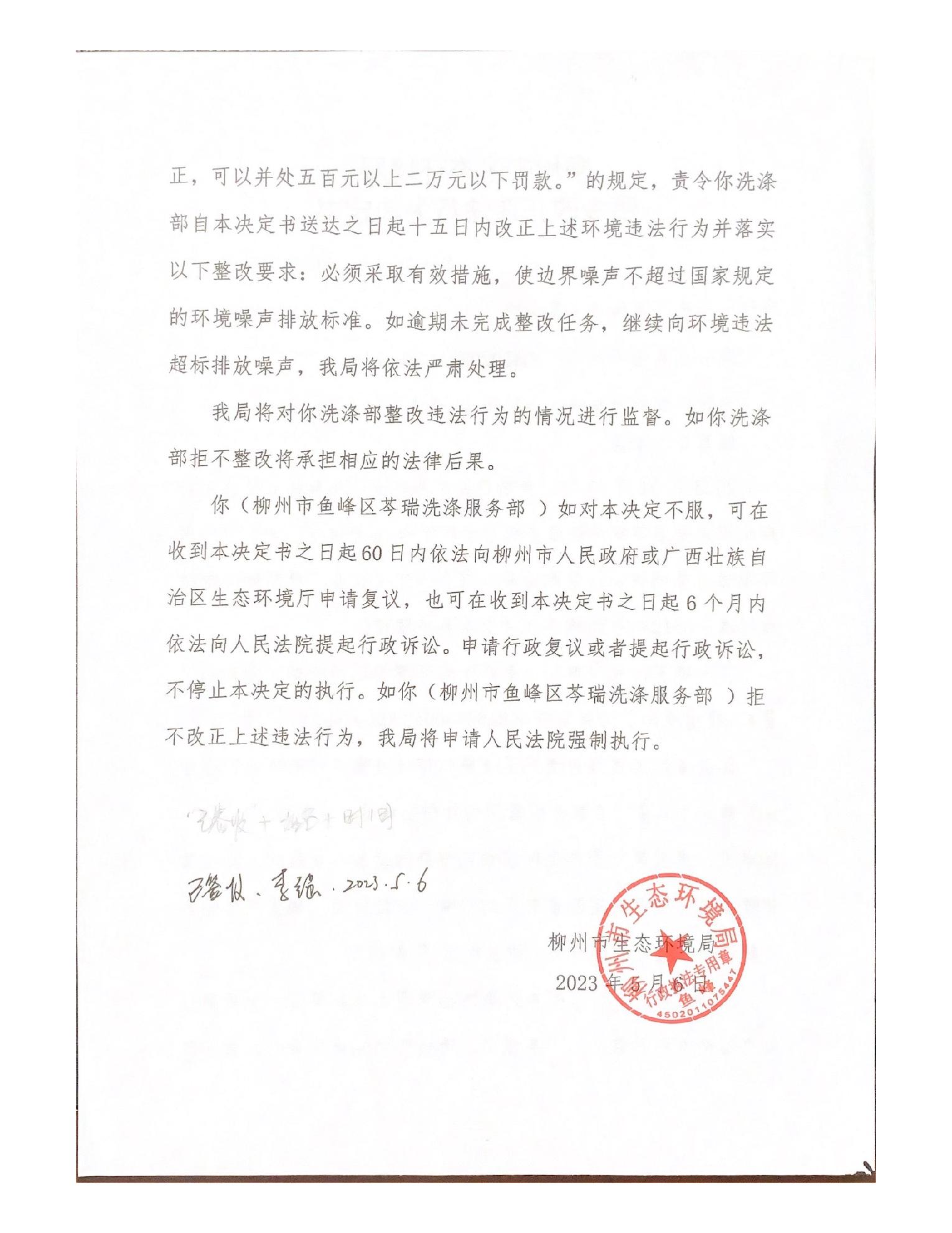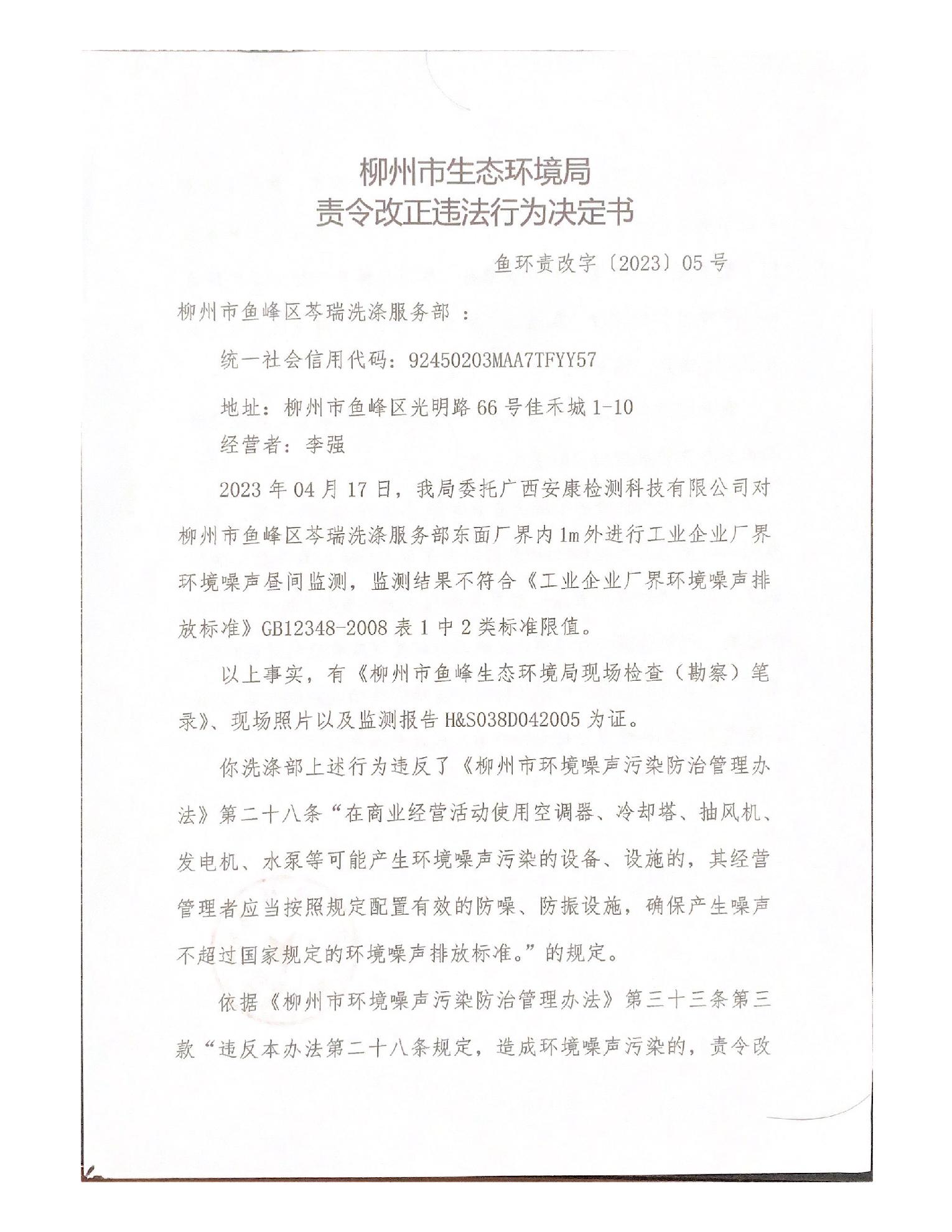 柳州市生态环境局责令改正违法行为决定书(鱼环责改字〔2023〕6号)柳州市鱼峰区努尔餐饮店