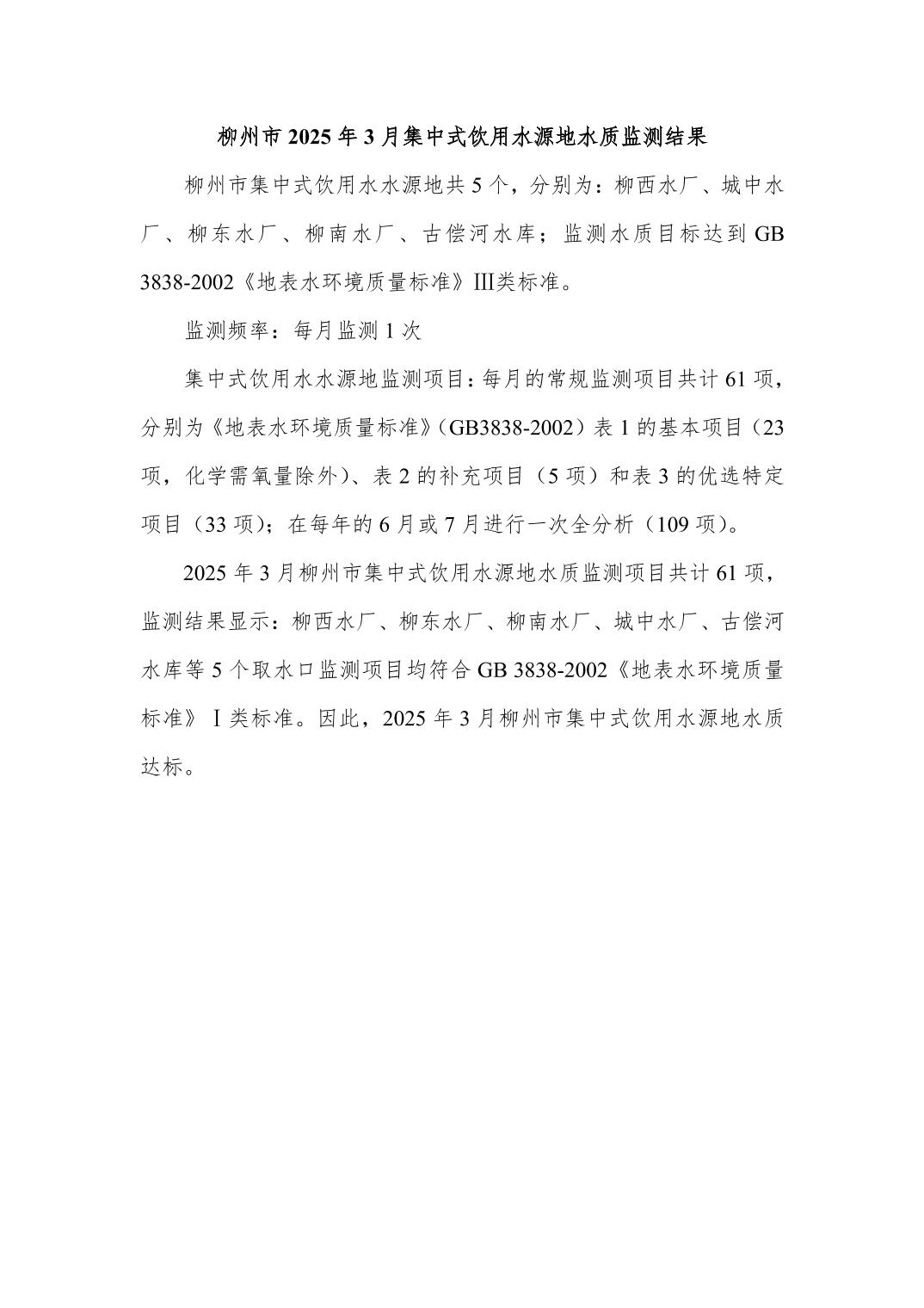 2025年3月份柳州市市级饮用水质量报告