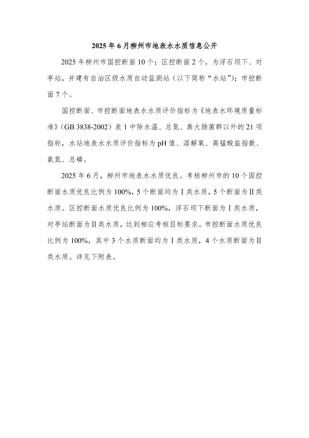 2025年6月份柳州市地表水质量报告