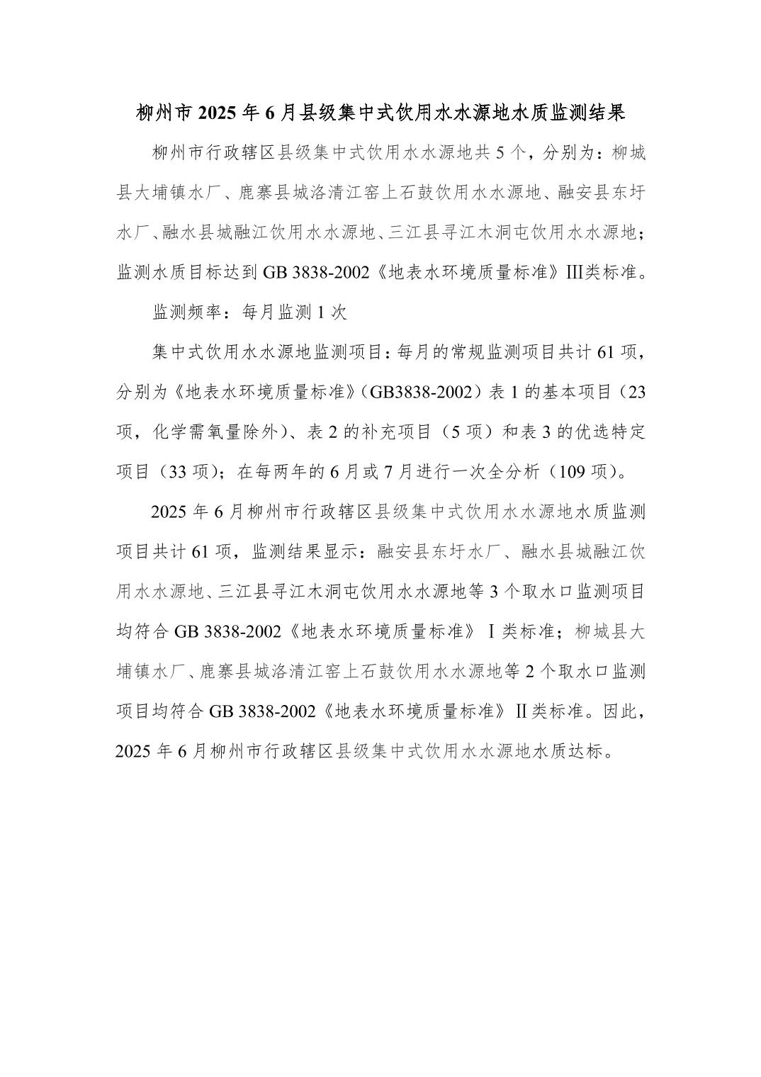 2025年6月份柳州市县级饮用水质量报告