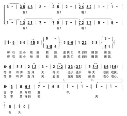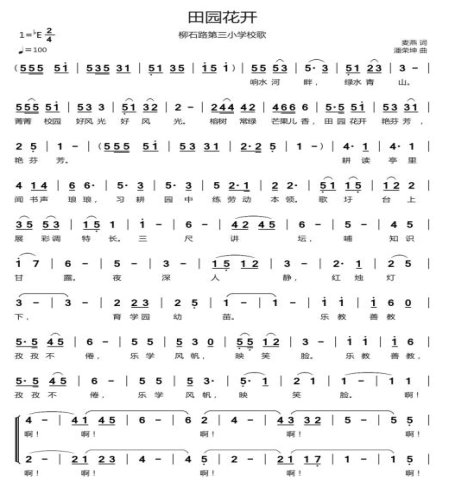 校歌《田园花开》为原创作品,歌曲欢快活泼,体现小学生蓬勃的朝气,同时尽可能地采用广西少数民族的音调,体现孩子们爱祖国、爱家乡的情怀。(校歌曲谱附后)