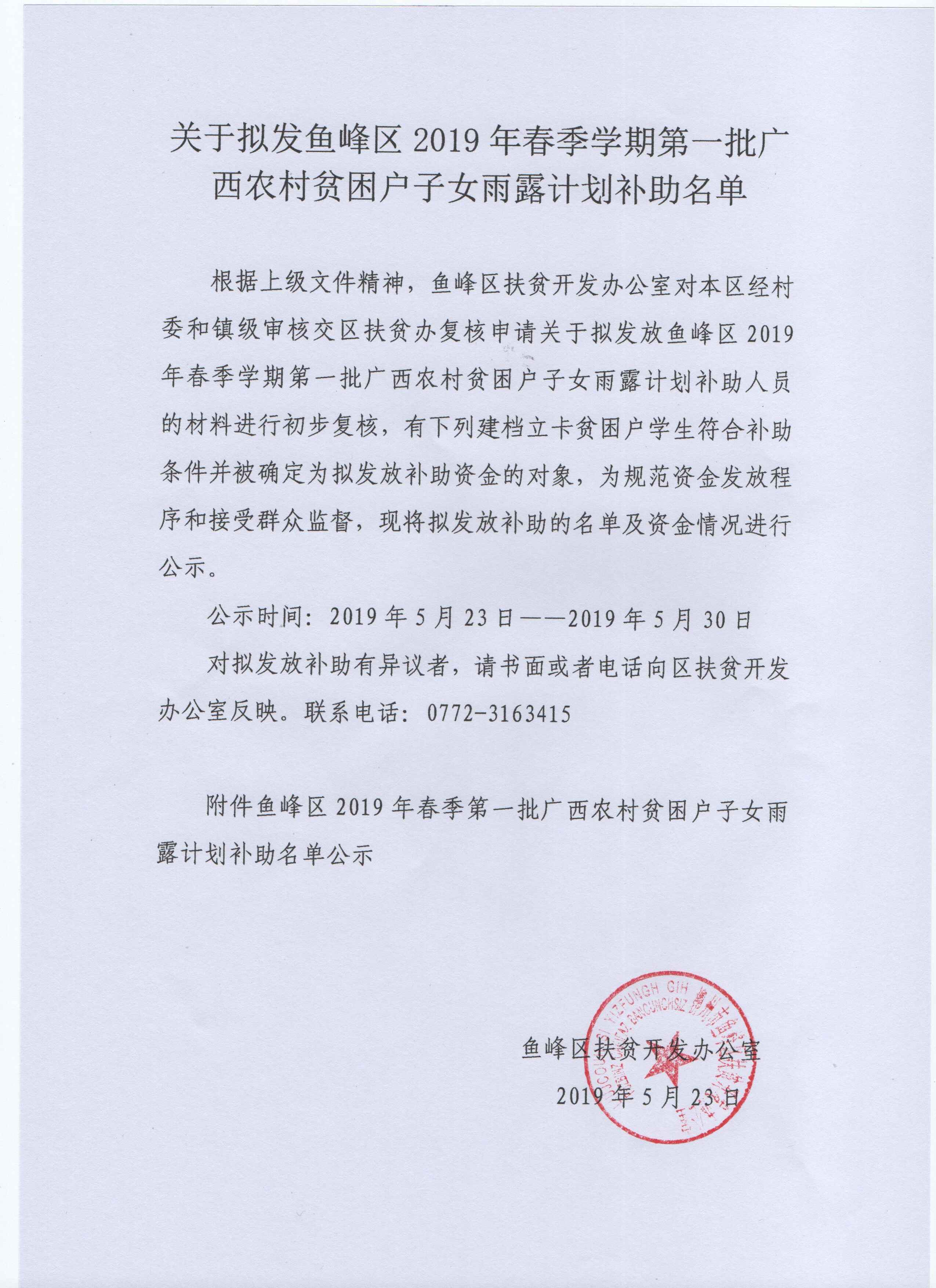 关于拟发鱼峰区2019年春季学期第一批广西农村贫困户子女雨露计划补助名单