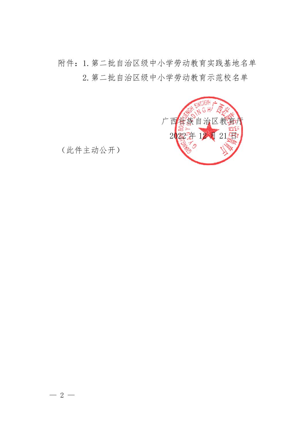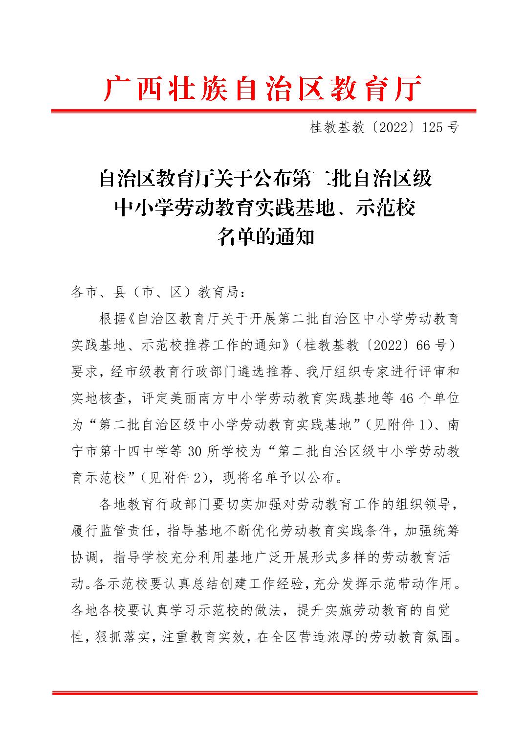 桂教基教〔2022〕125号 自治区教育厅关于公布第二批自治区级中小学劳动教育实践基地、示范校名单的通知