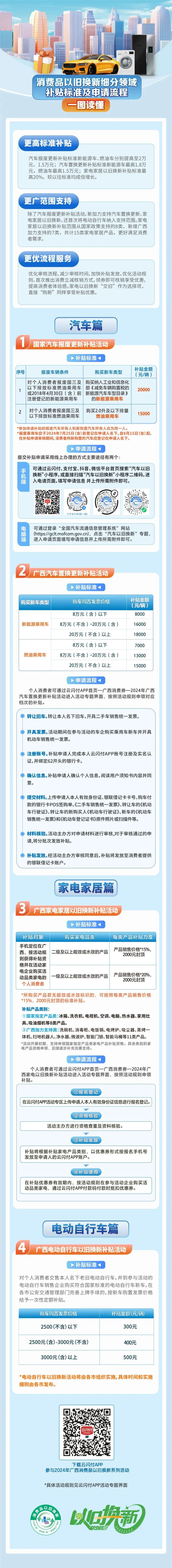 近期,2024年广西家电以旧换新补贴活动在全区火热开展,汽车补贴再“加码”、电动自行车补贴新“首发”、家电家居补贴再“扩围”。报废旧车买新车最高补贴2万元;电动自行车新车购置最高补贴500元;补贴家电产品增至15类……此次换新政策力度空前,在更高标准补贴、更广范围支持、更优流程服务上持续“加力”,让更多“真金白银”优惠直达消费者。