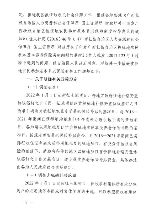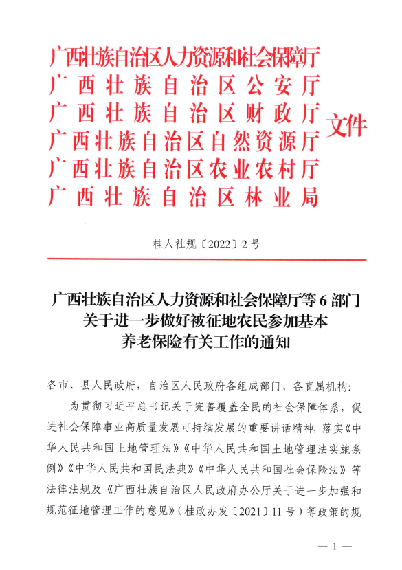 - 桂人社规〔2022〕2号 广西壮族自治区人力资源和社会保障厅等6部门关于进一步做好被征地农民参加基本养老保险有关工作的通知