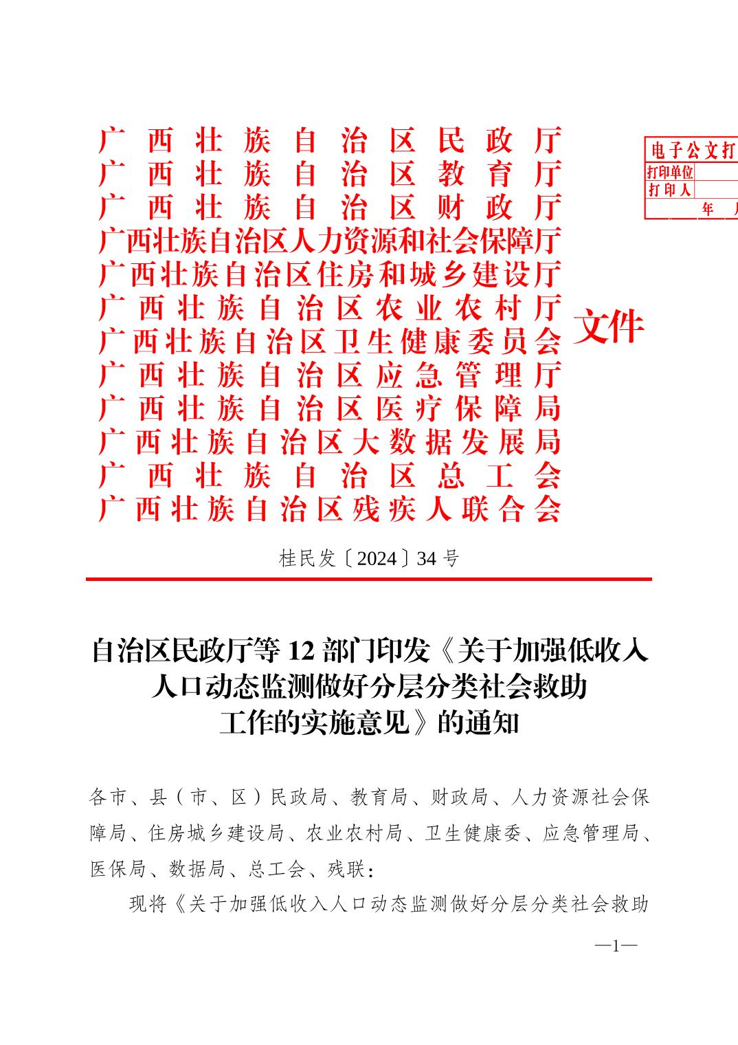桂民发〔2024〕34号 自治区民政厅等12部门印发《关于加强低收入人口动态监测做好分层分类社会救助工作的实施意见》的通知