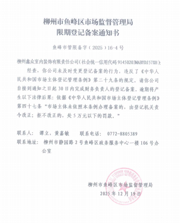 附:《限期登记备案通知书》(鱼峰市管限备字﹝2025﹞16-4号)
